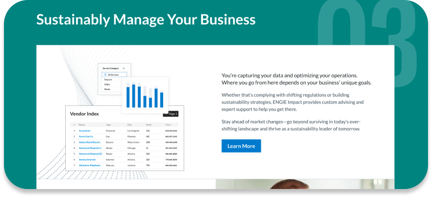 The design applies a refined, modern visual language to reinforce ENGIE Impact’s position as a strategic, enterprise partner.